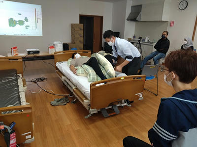 静岡済生会総合病院 皮膚・排泄ケア認定特定看護師さんとアルケア株式会社さんのご指導のもと、モニターで体圧の状態を可視化しながら「ポジショニング」と「除圧方法」について学びました。