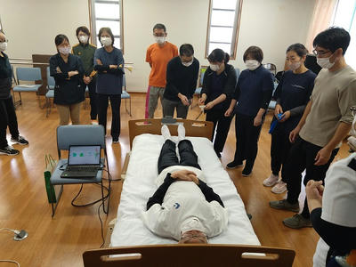 静岡済生会総合病院 皮膚・排泄ケア認定特定看護師さんとアルケア株式会社さんのご指導のもと、モニターで体圧の状態を可視化しながら「ポジショニング」と「除圧方法」について学びました。