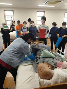 続いてポジショニングをどのようにしたらいいのか悩んでいる入居者さんを実際に見ていただき、直接指導を受けることにしました。