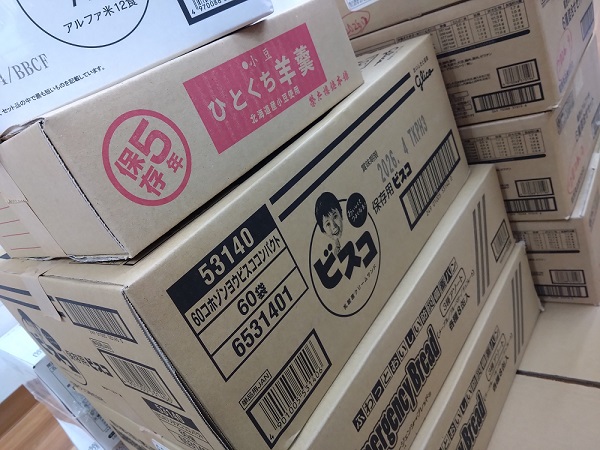 ごはんは味付きやカレーなど、また、温めなくても美味しく食べられるものや準備や配布が楽なもの。パンは缶だとゴミがかさばるので缶ではない包装のもの、甘味は食べきれる大きさで個包装されていて万人受けしやすいもの…と注文させてもらいました。(いろいろワガママを言ってスミマセン)