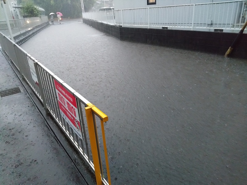 17:50の時点で、だいたい12cm~18cmくらいの水深だったと思います。帰宅する途中でも何ヶ所か冠水しているところがあり、警察の方や消防の方が迂回するよう促していました。まだまだ台風シーズンに入ったばかりです。地震はいつ発生するのか予測できませんが、台風は発生から進路や降水量などが予測できるのでしっかり対策を立てるようにしましょうね。