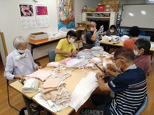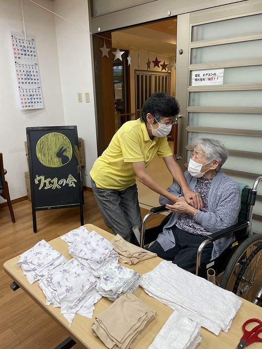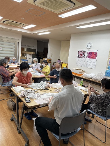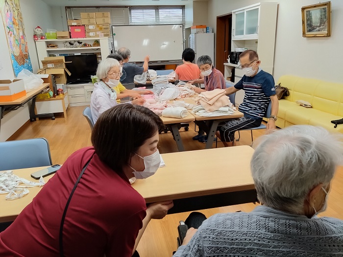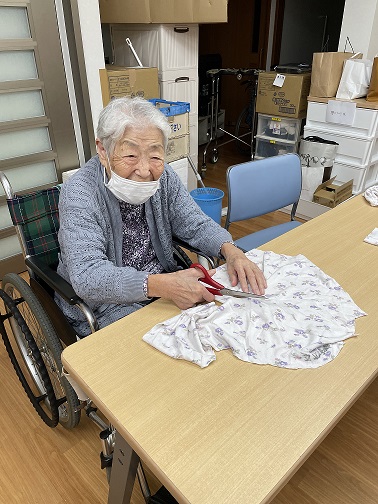 いつもはおしゃべり目的に参加されていますが、「私も何か手伝いたい」とおっしゃられたので、それでは…と布とハサミを渡し、お願いしました。