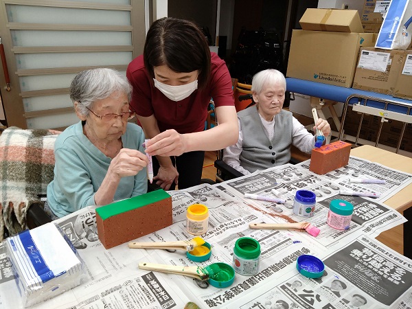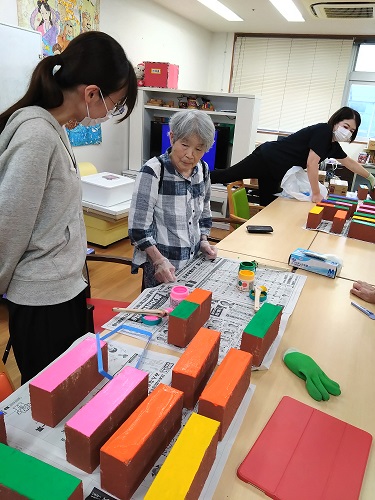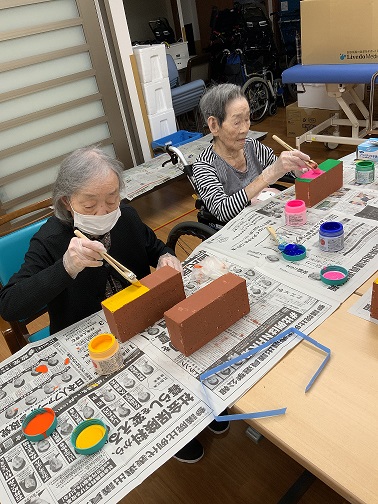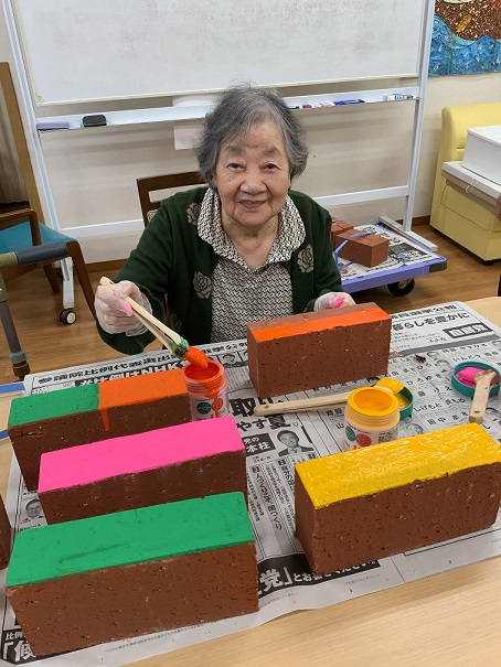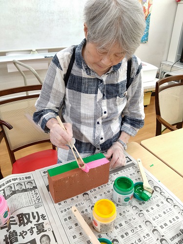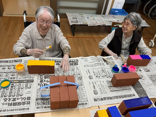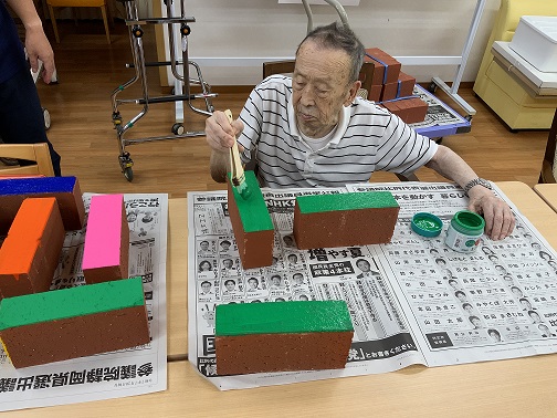 8/23,8/30に予定している次の工程(レンガ積み)に向けて、入居者さんとレンガのペイントを行いました。ペンキが乾かないうちに次の色を塗ると混じってしまうため、今日は下地の色を塗ることにしました。