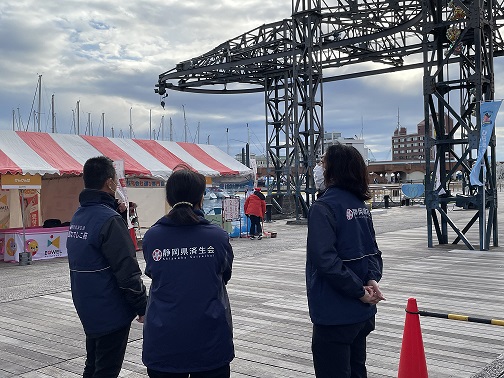 我々は、前日(11/23)に「駿河ふれあい福祉フェスタ」や「ケアコン」があったため11/24(日)に行ってまいりました。8:30に現地集合して会場準備を開始。屋外で、しかも目の前が海のデッキということもあり、風が冷たいこと…