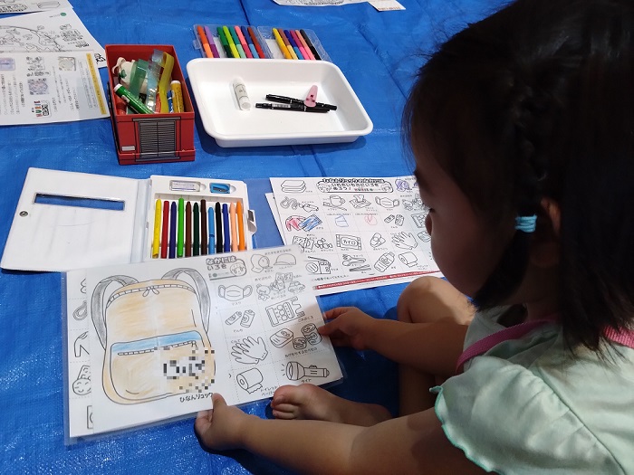 今回の訓練では、講演会、展示コーナーだけでなく乳幼児が飽きないよう「スタンプラリー」も取り入れられていました。また、ビニール袋を使ったご飯作りや、お菓子のじゃがりこでポテトサラダ作って食べたりすることもできました。