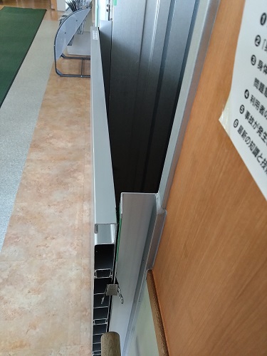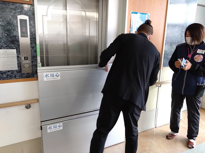 令和4年の時には、この手すりより上まで水が来たそうです。ちなみにエレベーターの復旧が一番最後で、それも半年先になったとのことです。そこでエレベーターを守りために導入したのが、この「水用心」というパネルとのことですが、まだ実際に使用していないので真価のほどは不明だそうです。