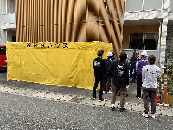 昨年は起震車にて『震度7』の体験をさせていただきましたが、今年は『スモークハウス』にて煙が充満した中での避難体験をさせていただきました。
