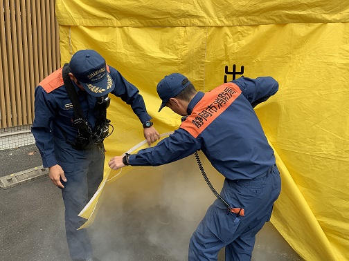 次に数グループに分かれて『スモークハウス(体験)』『トリアージ(講義)』『応急手当(演習)』『感染症対策(個人防護具の着脱訓練)』です。