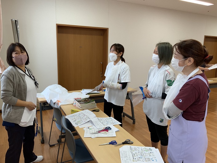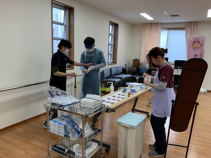 こちらは感染症対策訓練(個人防護具の着脱訓練)の様子です。