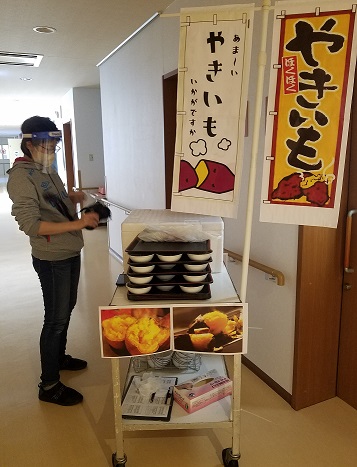 PT(理学療法士)と管理栄養士が寒い冬にこそ、『熱々でおいしい焼き芋を食べていただきたい』と3ヶ月ほど前より構想を練り始め、芋を厳選し、雰囲気を出すためにワゴンにのぼり旗を付けてリヤカー風にしたりと準備していた「おやつレク」を昨日行いました。
