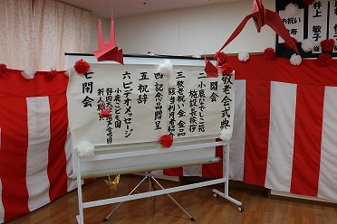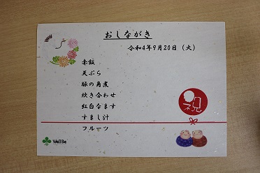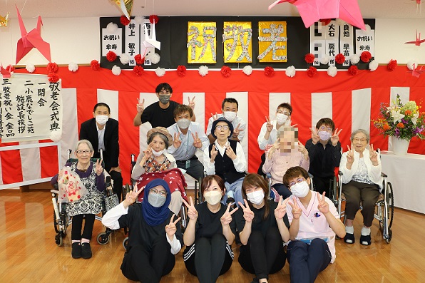 令和4年9月20日(火)「敬老会式典」および「お楽しみ会」を開催いたしました。今年も新型コロナウイルス感染症に配慮した形での開催のため、ご家族様もボランティアの方もお招きせず、職員のみでささやかにお祝いさせていただきました。今年度は「米寿」の方が3名、「傘寿」の方が2名です。開式の挨拶で介護長も言っていましたが、本当に皆さん年齢より「若く」見えます。