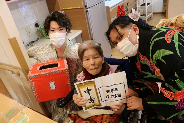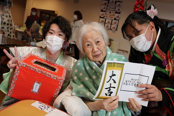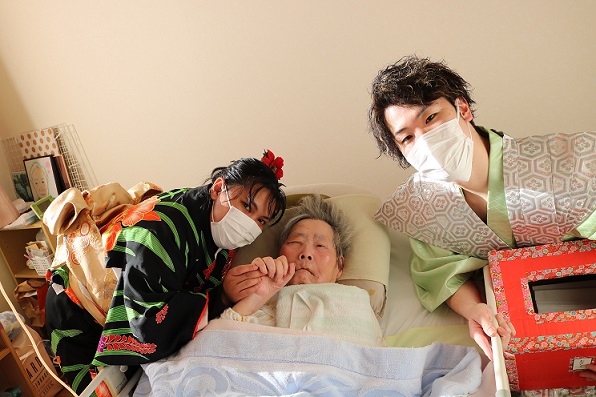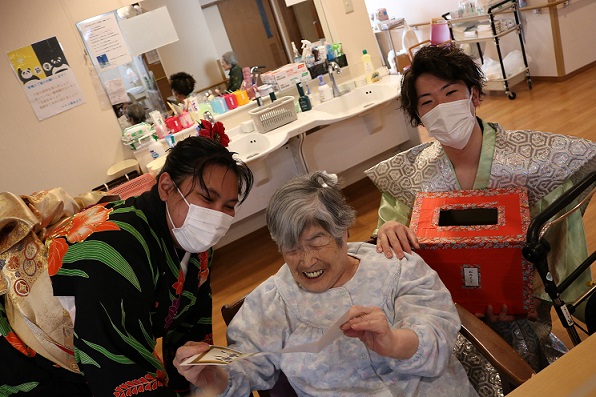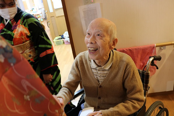 普段目を閉じていることが多い方が目をパッチリ開けて下さったり、自分から手を伸ばしてきて着物に触れたりと、皆さんの反応の良さに企画した職員たちが喜んでおりました。