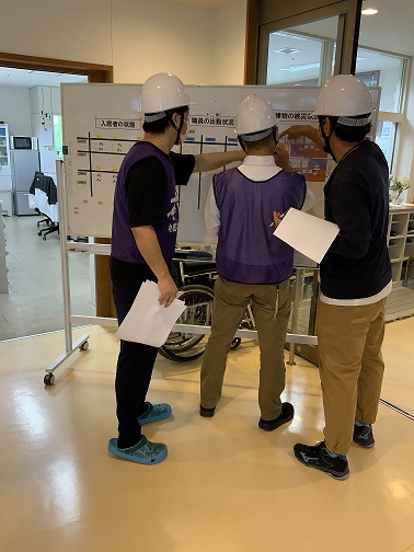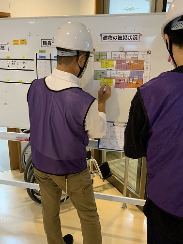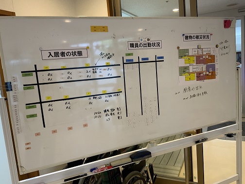 今回から本部にはホワイトボードを設置し、入居者様や職員の状態、建物の被災状況、外部との連絡状況などを記載するようにしました。これは、参集した職員がホワイトボードを見ることで自ら情報を得るためです。
