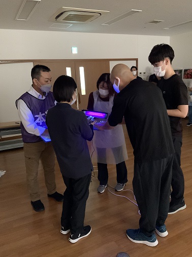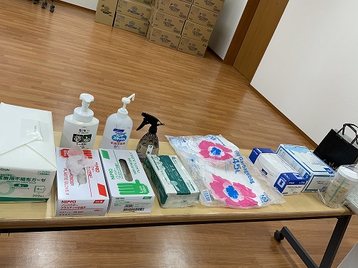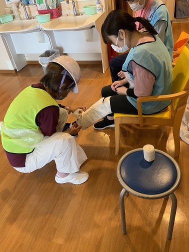 「ノロウイルス」に罹患していると思われる方が嘔吐した吐物を処理する…という設定の訓練も行いました。