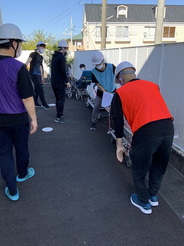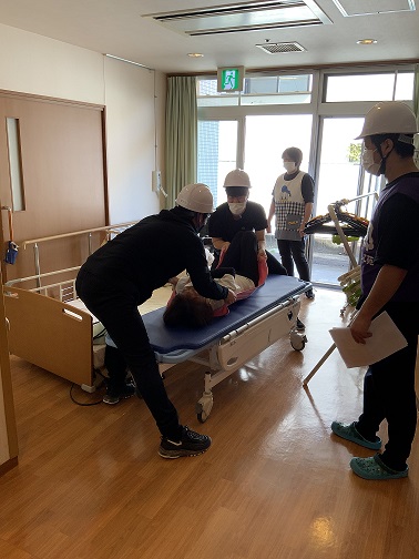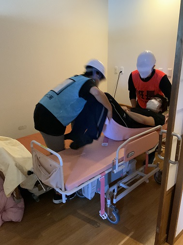 前回の訓練で、ベッドのまま屋外へ避難できないことは確認済みのため、今回はストレッチャーへ移してから屋外へ避難しました。平日の日中であれば人手があるためピストン輸送も可能ですが、これが夜間の場合は正直厳しいと思いました。被災時には