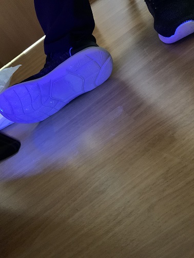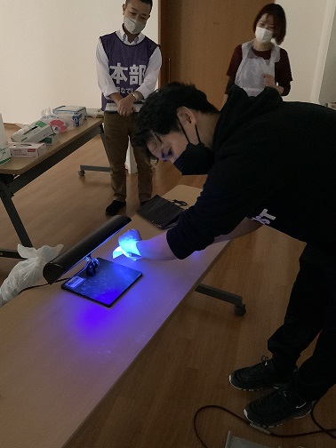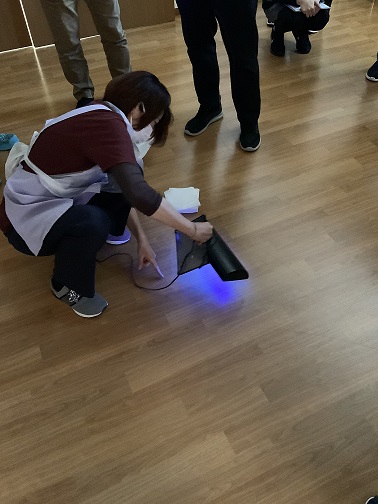 しかも、この吐物には蛍光塗料も含まれているため、処理後にブラックライトを当てると床や靴の裏に汚染が… 目に映る汚れだけではなく、最後に次亜塩素酸ナトリウムでしっかり拭取らないとダメだということがよく分かりました。また、吐物を処理する時には吐いた人の方から処理に入らないと、吐物を踏んで汚染範囲を広げてしまうことになることも分かりました。