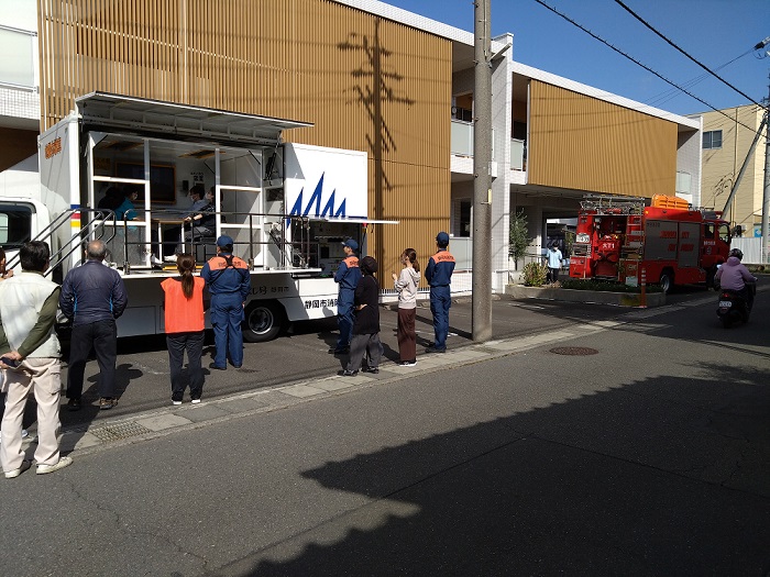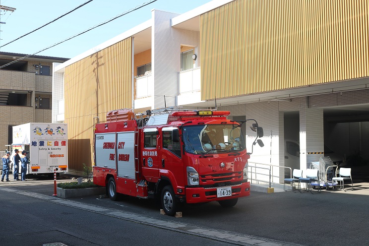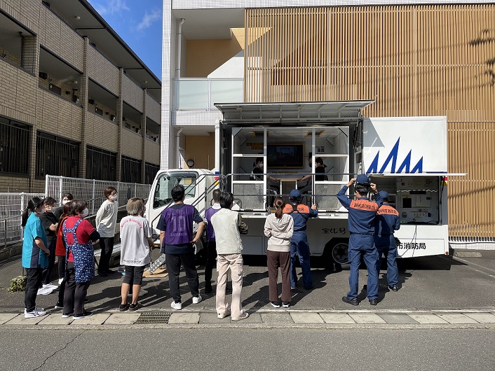 今年は「通報訓練」「初期消火訓練」「避難誘導訓練」「職員の安否コール訓練」「感染症対策訓練」以外に、震度7を体験するべく駿河消防署に「起震車」を要請してみました。せっかく震度7の揺れを体験できるのであれば職員だけでなく、地域の方にも体験していただこう…ということで事前にSデイ、サロン、カフェにてアナウンス。自治会長さんには訓練の立会いをお願いしてみました。