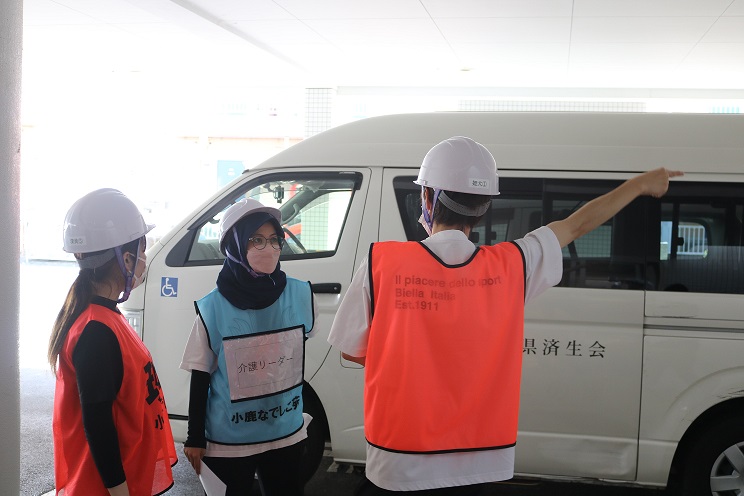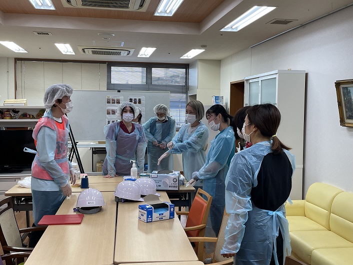 続いて「震度7の体験」と、感染症対策訓練として「予防着を脱ぐ手順について」2グループに分かれて行いました。起震車の方は、駿河消防署・大谷出張所の隊員の方が、感染症対策訓練の方は看護師が担当しました。
