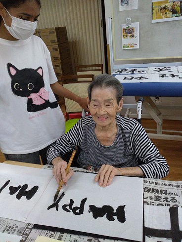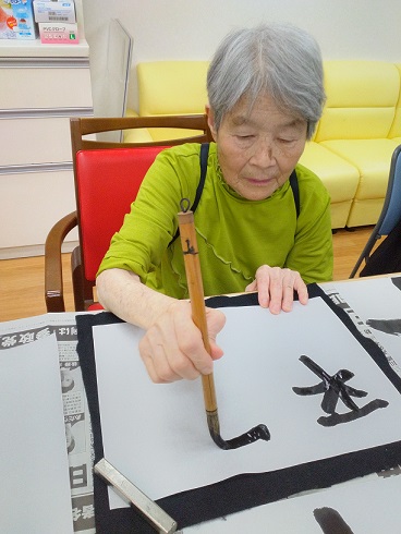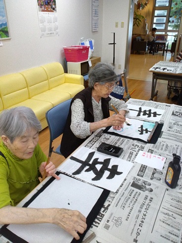 小鹿自治会より夏祭りで使う灯篭用に「絵」や「字」を書いてほしいと依頼があり、早速、入居者さんたちと作業を開始。