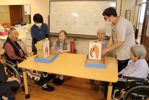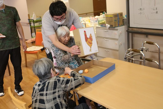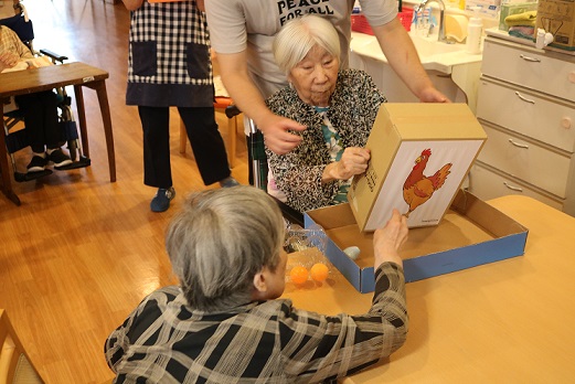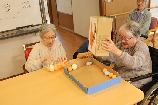 段ボール箱の中には卵の代わりにピンポン玉などが入っています。箱を上下に振って下の小さな穴からピンポン玉を出して卵のパックに詰めて輪ゴムで留めるゲームです。