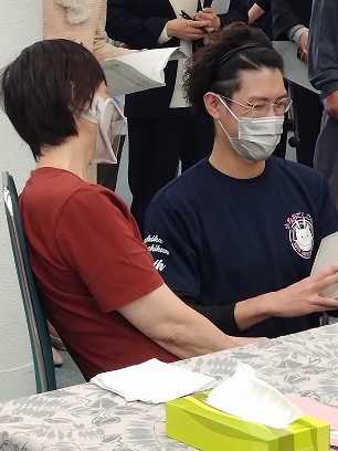 整容と着替えをすませ、居間の椅子に座っている福士さんに対し、デイサービスに行くための支援を行うことが課題とされました。デイサービスに出掛けることに対して気持ちが向かない福士さんにどのような声掛けやアプローチをするか、参加者の皆さんはずっとシミュレーションしていたようです。